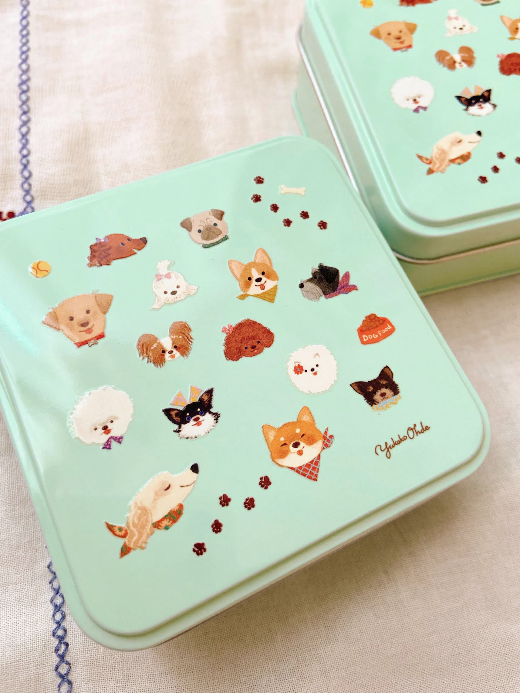 飼い主さんに可愛くおめかししてもらった、チャーミングな表情がずらりと並んだわんちゃんたちが並んだ小さなスクエア缶。